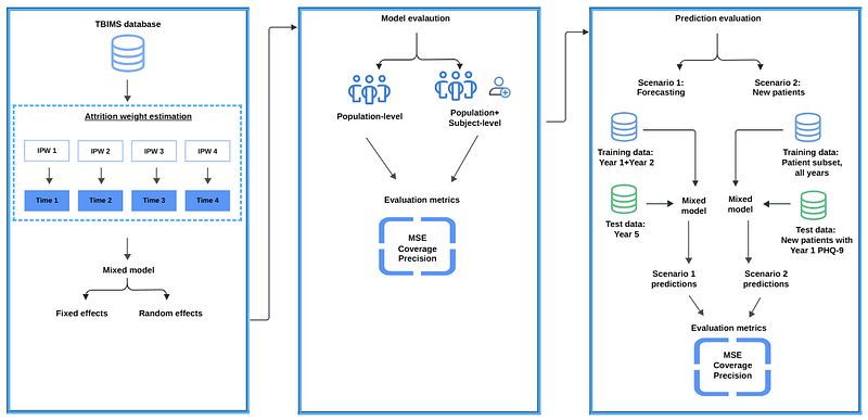 Depression trajectories following TBI exhibit substantial individual heterogeneity. Population-level models alone inadequately capture this complexity, while models incorporating both population and subject-level variations significantly improve predictive performance. This modeling approach demonstrates the potential for predicting depression trajectories in clinical settings, thereby facilitating individualized assessment and intervention.